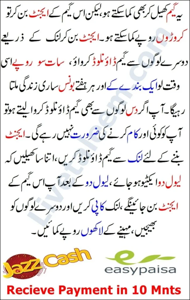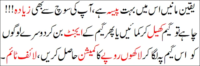 آپ موبائل پہ گیم کھیلنے کے شوقین ہیں تو اس شوق کو روزگار میں بدلیں، لاکھوں نوجوان تین پتی گیم سے روزانہ لاکھوں روپے کما رہے ہیں، کھیل کر اور دوسرے لوگوں کو اس گیم پہ ریفر کر کے۔ نیچے ان گیمز کی ڈاونلوڈ لنکس موجود ہیں ابھی اپنے موبائل میں انسٹال کریں اور پیسہ کمانا شروع کریں۔ اپنی کمائی دس منٹ کے اندر ایزی پیسہ اور جیز کیش میں حاصل کریں